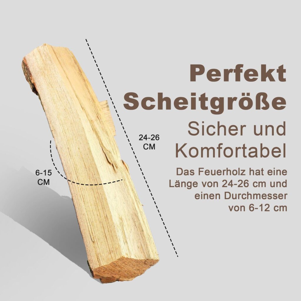 „Erhältlich in 25 cm, 33 cm oder 50 cm – abgestimmt auf jede Ofen- oder Kaminart. Sauber gespalten und ofenfertig verpackt für müheloses Handling.“
